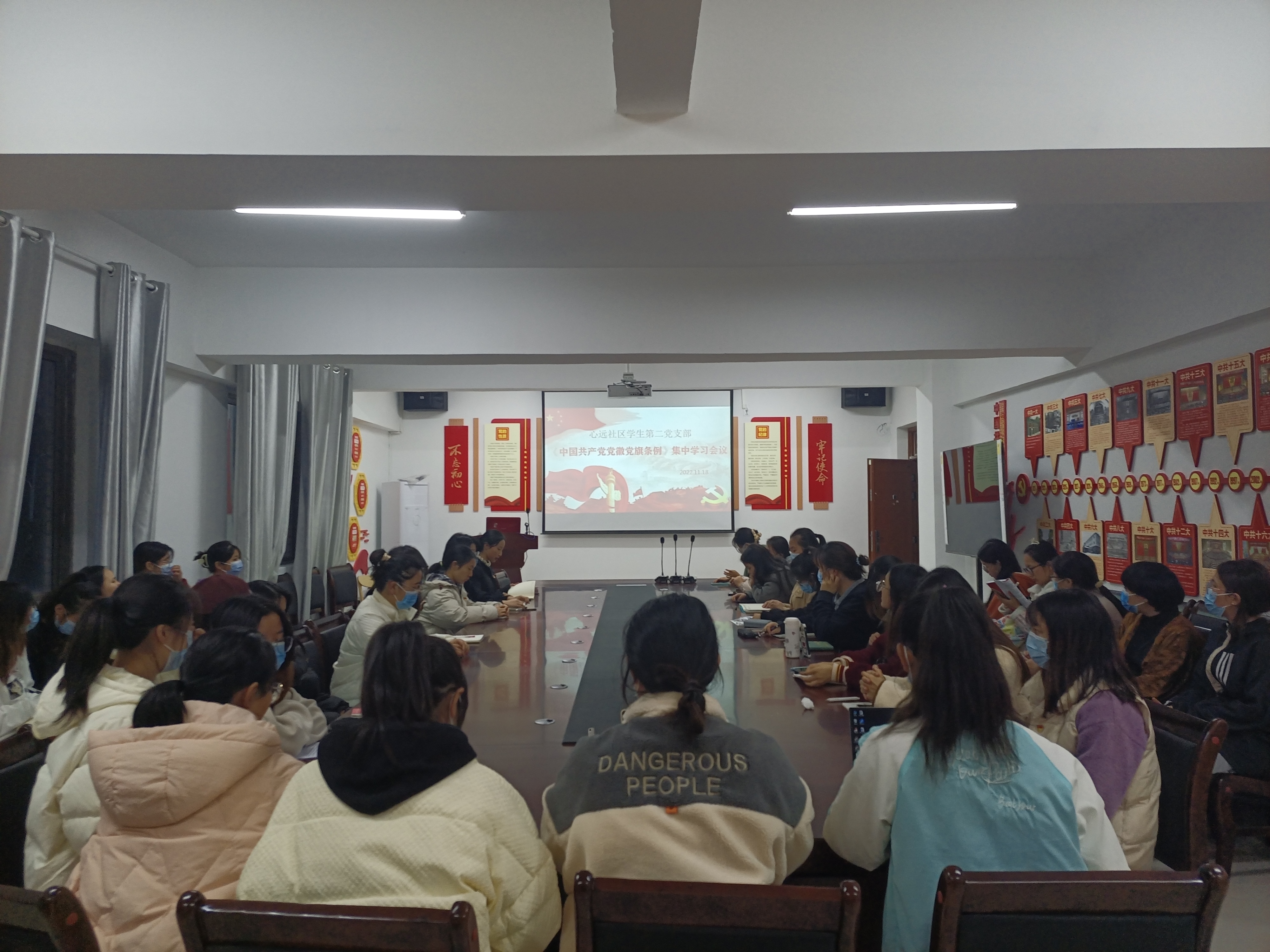 11月18日下午6:00,由公共卫生院党委管理的心远社区学生第二党支部在心远社区205党团活动室集中学习了《中国共产党党徽党旗条例》,支部全体党员参加会议。党支部书记、公共卫生学院2019级食品质量与安全专业张译文主持学习会。