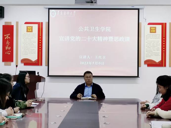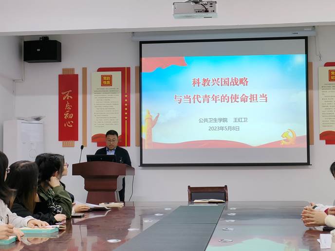 公共卫生学院党委副书记王红卫以《科教兴国战略与当代青年的使命担当》为题为大家宣讲党的二十大精神暨思政课。他重点从教育、科技、人才三个方面解读了党的二十大精神,以当代青年的使命担当为落脚点,激励青年大学生传承好五四精神,树立远大理想、练就过硬本领,自觉肩负起实现中华民族伟大复兴的历史使命,努力在奋发作为中绽放无悔青春。