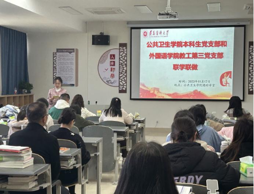 11月17日,学院本科生党支部与外国语学院教工第三党支部在公共卫生学院“遇时学堂”开展联学联做活动。会议由公共卫生学院本科生党支部书记张爱平同志主持,公共卫生学院本科生党支部毕业年级党员、考研学生和外国语学院教工第三党支部教师党员参加活动。