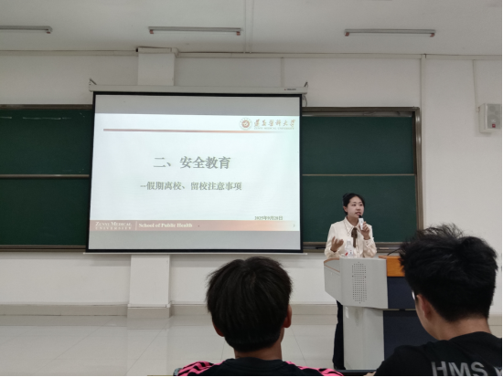 风清遇秋凉,国迎华诞至。为进一步增强同学们的安全意识,确保大家度过一个平安、充实、愉快的国庆与中秋假期,9月28日晚,学院2025级全体同学于第四教学楼38阶梯教室召开假期安全教育年级大会。学院党委副书记兼25级辅导员王红卫、兼职班主任罗意老师、研究生、本科生班导参加会议,会议由25预防班主任王漫老师主持。
