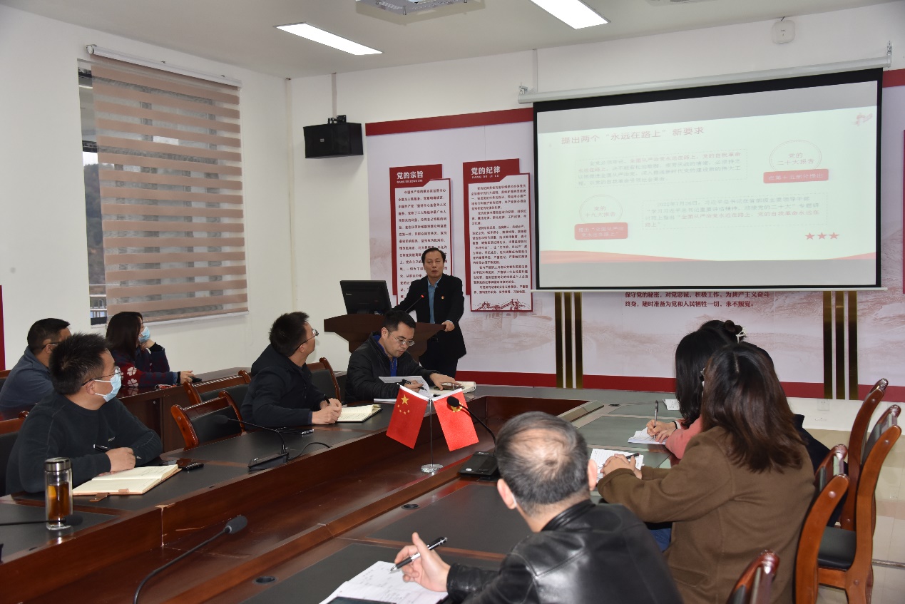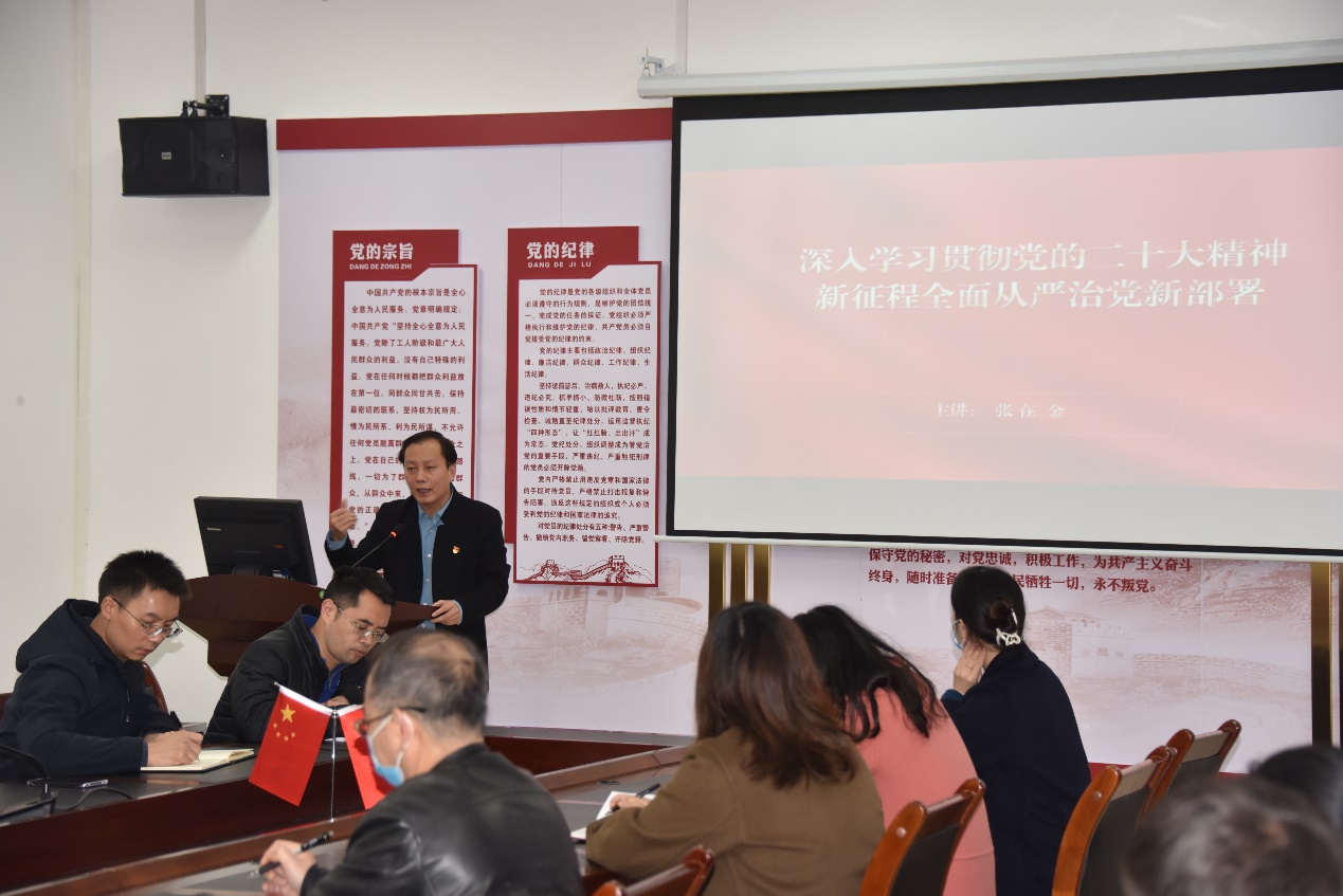 会上,张在金同志以《深入学习贯彻党的二十大精神 新征程全面从严治党新部署》为题讲授专题党课,带领同志们学习了习近平在中国共产党第二十次全国代表大会上的报告中的第十五部分 ——坚定不移全面从严治党,深入推进新时代党的建设新的伟大工程。张在金同志以中国共产党过去五年和新时代十年来所取得的成就为切入点,对深入推进新时代党的建设伟大工程中全面从严治党的具体要求和举措,以及推进新时代党的建设新的伟大工程中全面从严治党所提出的新要求、新思路、新观点和新举措等进行了全面的阐述。他强调,党的领导是全面的、系统的、整体的,必须全面、系统、整体加以落实,要坚持不懈用习近平新时代中国特色社会主义思想凝心铸魂,要完善党的自我革命制度规范体系,要建设堪当民族复兴重任的高素质干部队伍,要增强党组织政治功能和组织功能,要坚持以严的基调强化正风肃纪,坚决打赢反腐败斗争攻坚战持久战。