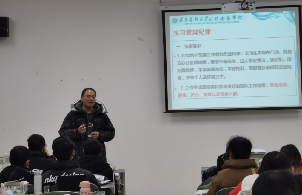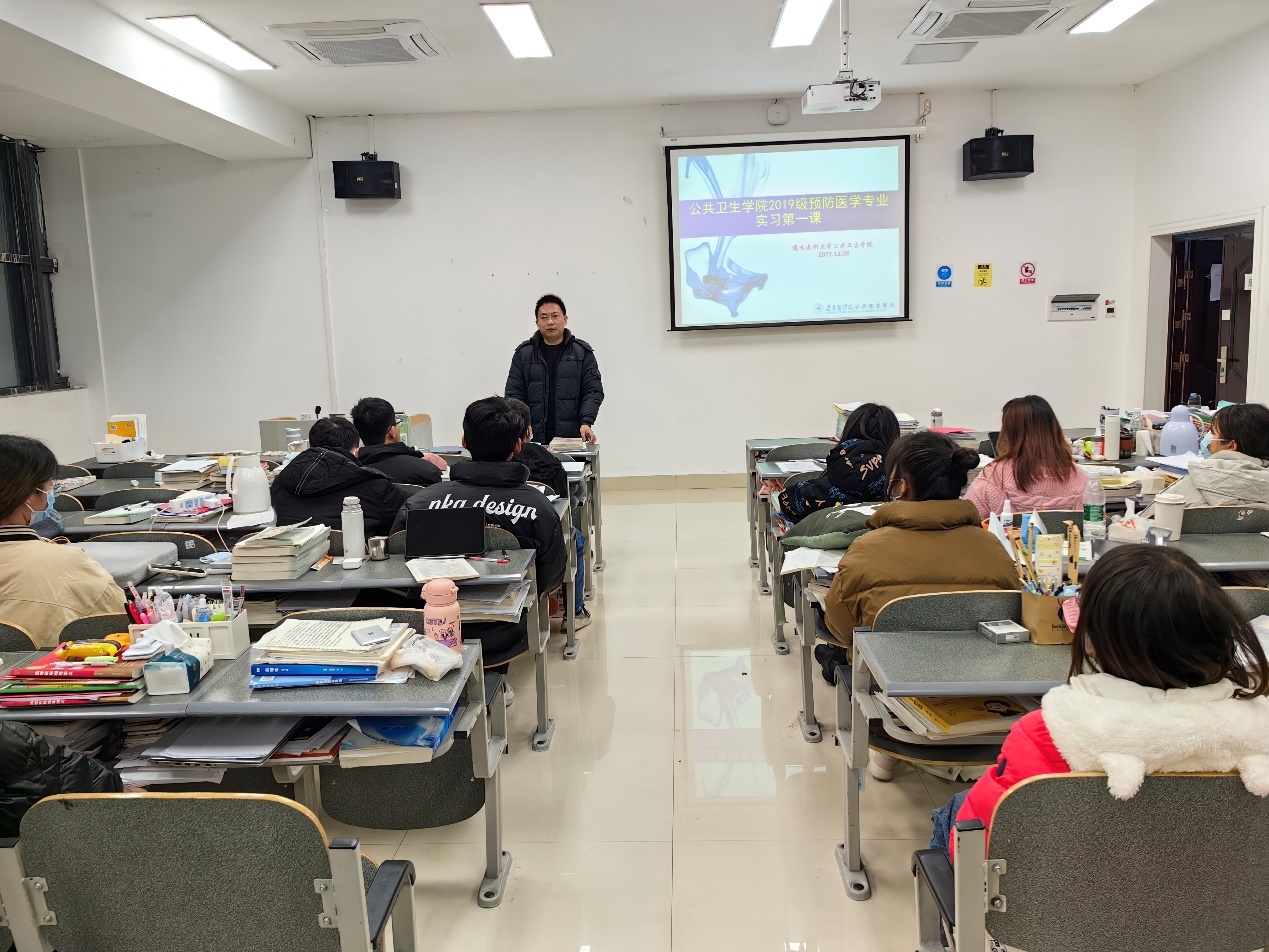 2022年12月8日下午6:30时公共卫生学院于四号教学楼A-509召开2019级预防医学本科专业实习动员会。2019级预防医学的全体同学参加了此次会议。会议由公共卫生学院副院长周远忠教授主持。