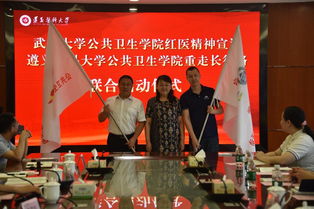 会上,武汉大学公共卫生学院党委与我校公共卫生学院党委签署了“党建结对共建协议”并举行了武汉大学公共卫生学院红医精神宣讲与我校公共卫生学院重走长征路活动联合启动仪式,李春鸣为双方领队授旗。