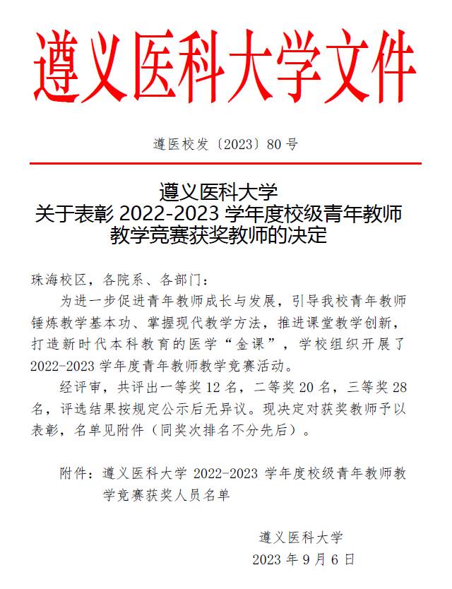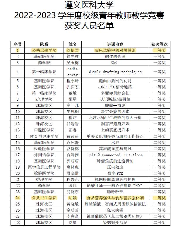 近日,2022-2023学年遵义医科大学青年教师教学竞赛及优秀课堂教师成绩公布结果,我院刘怡君老师喜获青年教师教学竞赛一等奖,胡颖老师喜获青年教师教学竞赛二等奖;张怡、刘怡君两位老师喜获本科课堂教学优秀教师称号。