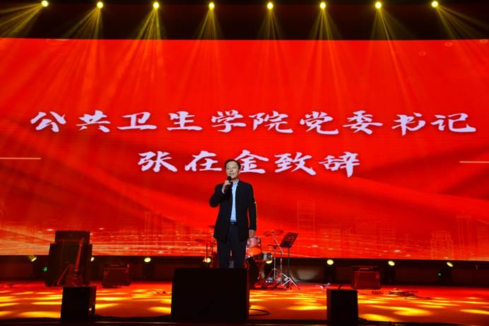 公共卫生学院党委书记张在金为本次晚会致开幕辞。他表达了对新生的欢迎,介绍了学院的发展,寄托了对师生的祝福,希望全院师生认真学习贯彻习近平新时代中国特色社会主义思想,坚持高质量党建引领学院高质量发展,主攻博士点建设目标,解放思想,开拓进取,力争早日建成高水平公共卫生学院!