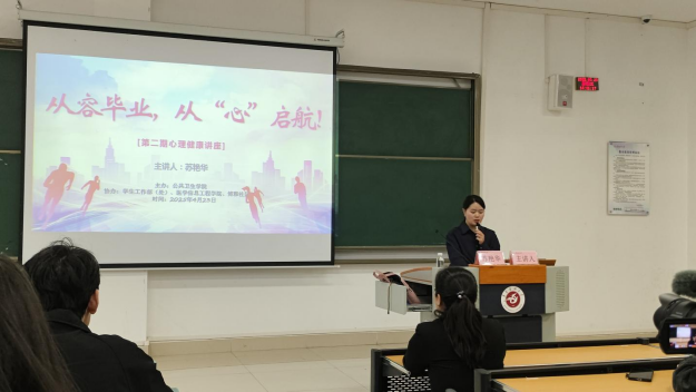 毕业季临近,为帮助毕业生调适心态、增强心理韧性,4月23日,我院联合学校学生工作部(处)、医学信息工程学院及博雅社区在新蒲校区四教三十八阶梯教室针对毕业年级开展了专题心理健康讲座,讲座由管理学院苏艳华博士主讲,学院全体辅导员及230余名毕业生到场参加,活动由公共卫生学院王莹老师主持。
