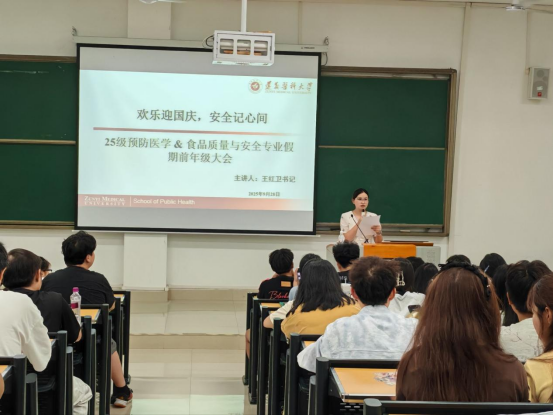 风清遇秋凉,国迎华诞至。为进一步增强同学们的安全意识,确保大家度过一个平安、充实、愉快的国庆与中秋假期,9月28日晚,学院2025级全体同学于第四教学楼38阶梯教室召开假期安全教育年级大会。学院党委副书记兼25级辅导员王红卫、兼职班主任罗意老师、研究生、本科生班导参加会议,会议由25预防班主任王漫老师主持。