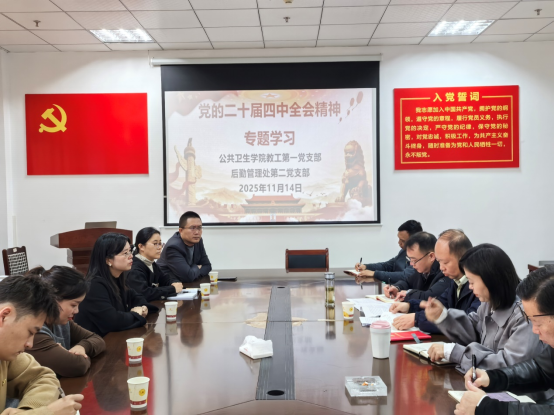 为深入学习贯彻党的二十届四中全会精神,11月14日上午,公共卫生学院教工第一党支部与后勤管理处第二党支部在后勤管理处党员活动室联合开展“学习贯彻党的二十届四中全会精神,联学联做促发展”主题活动。后勤管理处党总支副书记付开远,公共卫生学院党委委员、副院长刘俊以及两个支部的支部委员参加。后勤管理处第二党支部书记黄源劲主持活动。