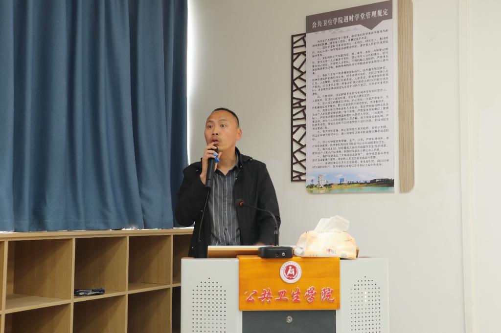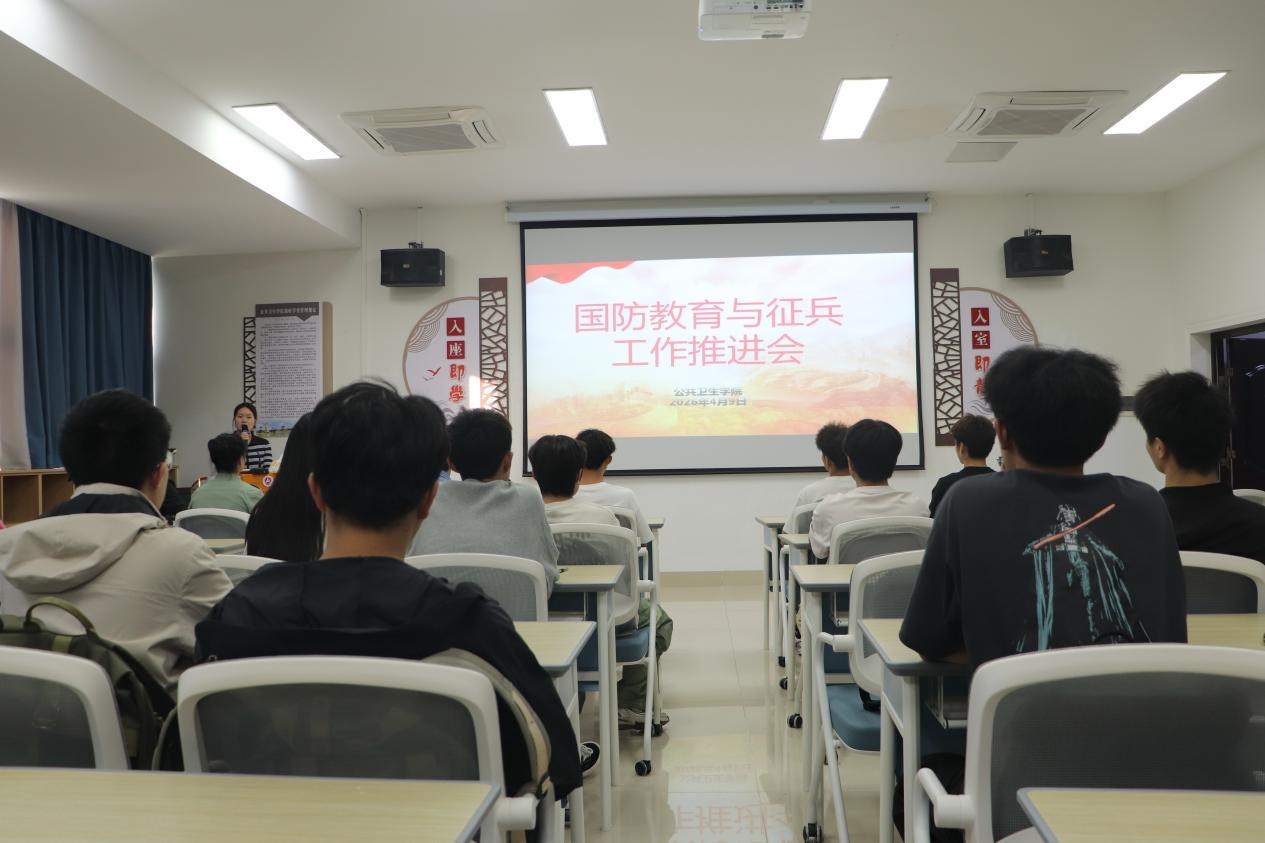 为加强国防教育和引导,让更多心怀赤诚的学子奔赴军营、报效国家,2026年4月9日,公共卫生学院在遇时学堂举行国防教育与征兵工作推进会。学院全体辅导员及数百名同学参加,活动由本科生第二党支部副书记王莹主持。