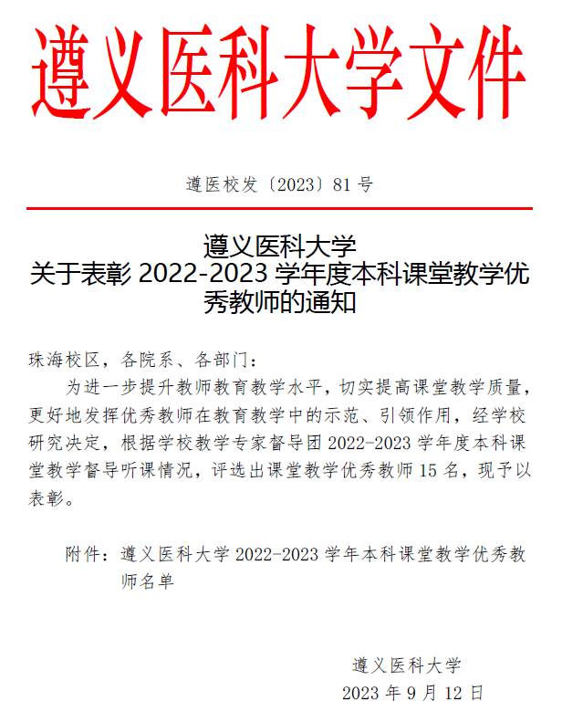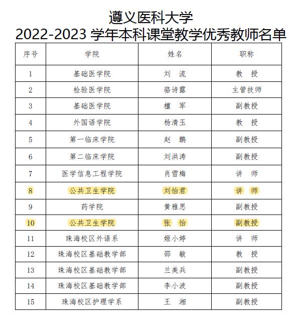 近日,2022-2023学年遵义医科大学青年教师教学竞赛及优秀课堂教师成绩公布结果,我院刘怡君老师喜获青年教师教学竞赛一等奖,胡颖老师喜获青年教师教学竞赛二等奖;张怡、刘怡君两位老师喜获本科课堂教学优秀教师称号。